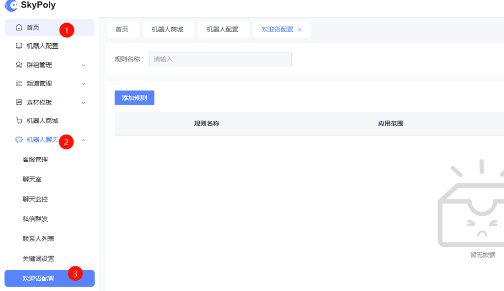 - 登录您的SkyPoly账户点击左侧导航栏「机器人聊天」模块选择「欢迎语配置」功能